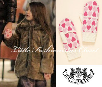 to keep her little hands warm, Suri chose Boxed Heart Pop Top Mittens by Juicy Couture.